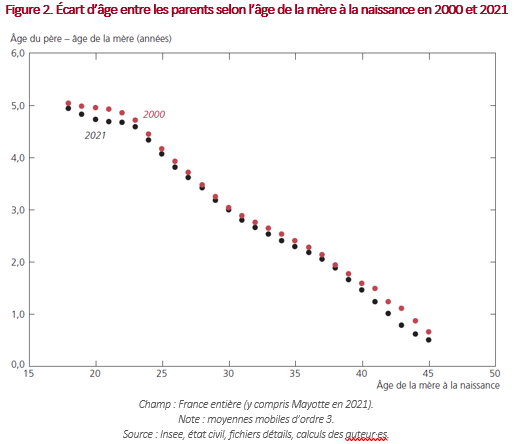 Les profils de fécondité par âge des hommes et des femmes sont différents, même entre 18 et 50 ans. L’écart d’âge à la naissance de leurs enfants entre les hommes et les femmes reste stable entre 2000 et 2021, proche de trois ans. Il est principalement lié à la différence d’âge au moment de la mise en couple. Il varie en revanche en fonction de l’âge de la mère à la naissance : proche de 5 ans lorsque la mère a moins de 20 ans, il diminue et s’approche de 0 à mesure que l’âge de la mère à la naissance de l’enfant augmente (figure 2). Cette différence d’âge des parents à la naissance de l’enfant diminue légèrement depuis 2000, et cela à tous les âges. Pour les hommes comme pour les femmes, l’évolution des profils de fécondité par âge au cours des vingt dernières années est marquée par le vieillissement du calendrier de la fécondité et une baisse de la natalité (figure 1B).