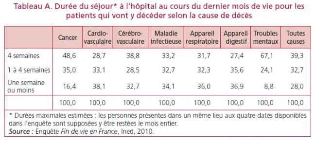 Ce décès est, en effet, intervenu au terme d'un séjour plus ou moins long à l'hôpital : 39,3 % des personnes décédées à l'hôpital y ont passé leurs quatre dernières semaines de vie, un tiers d'une à quatre semaines et 28 % ne s'y sont rendues que dans la dernière semaine de leur vie.