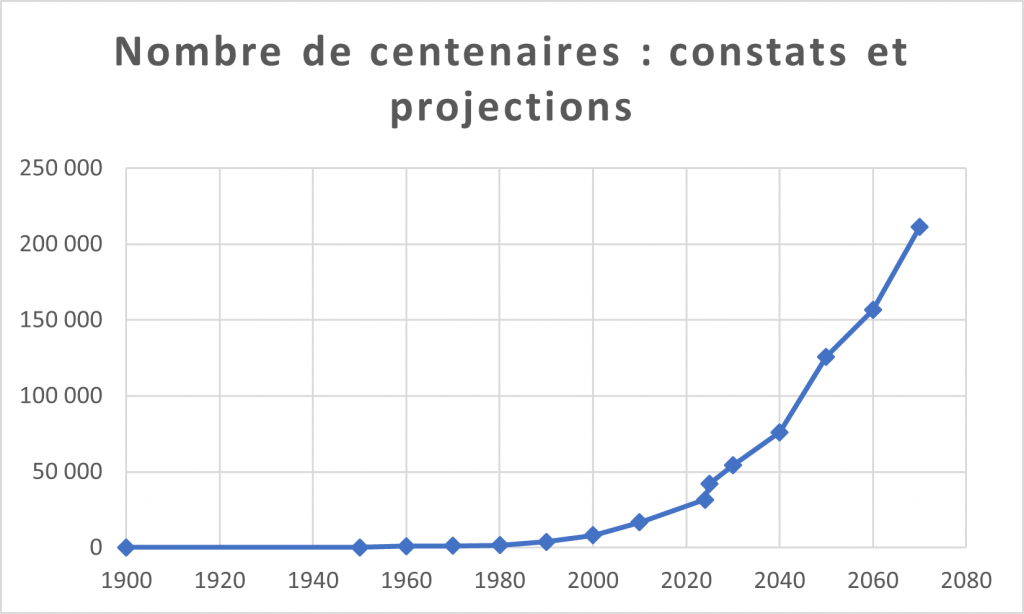 Alors que seules 0,02 % des personnes nées en France en 1850 sont devenues centenaires, cette proportion s’élève à 2 % pour la génération 1920 soit une multiplication par 100 de la probabilité d’atteindre 100 ans. L’augmentation du nombre de centenaires depuis la fin de la Deuxième Guerre mondiale est spectaculaire : plus de 1 000 centenaires en France en 1970, plus de 8 000 en 2000, plus de 31 000 au 1er janvier 2024, soit trente fois plus qu’il y a 50 ans. Sous l’hypothèse d’une poursuite des tendances actuelles de la mortalité, l’Insee projette plus de 200 000 centenaires en 2070 (Blanpain 2023).