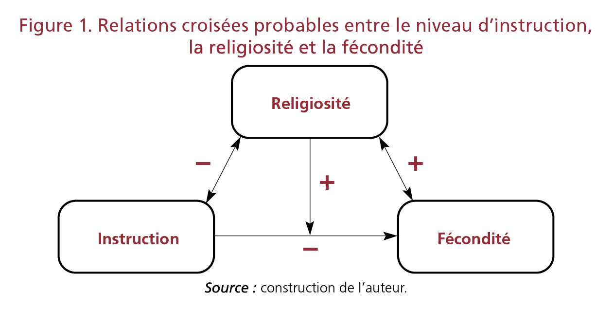 Lorsque haut niveau d’études et religiosité se combinent, quels effets produisent-ils alors sur la fécondité ? Le premier prédomine-t-il sur le second ou est-ce l’inverse ? Autrement dit, le sentiment religieux modère-t-il l’effet du diplôme de sorte que, à niveau d’étude comparable, la fécondité des femmes sans religion serait alors plus faible que celle des croyantes ? Ces relations croisées probables sont schématisées ci-dessous.